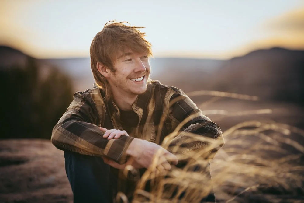 A young man with red hair smiling and sitting outdoors in a natural landscape during sunset, wearing a plaid shirt.