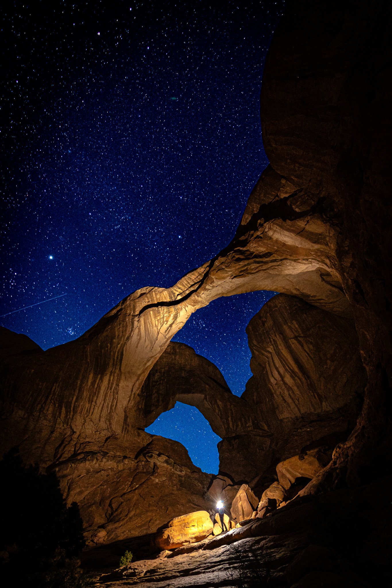 Nighttime view of rock formations with natural arches under a starry sky, a person holding a flashlight standing at the base.
