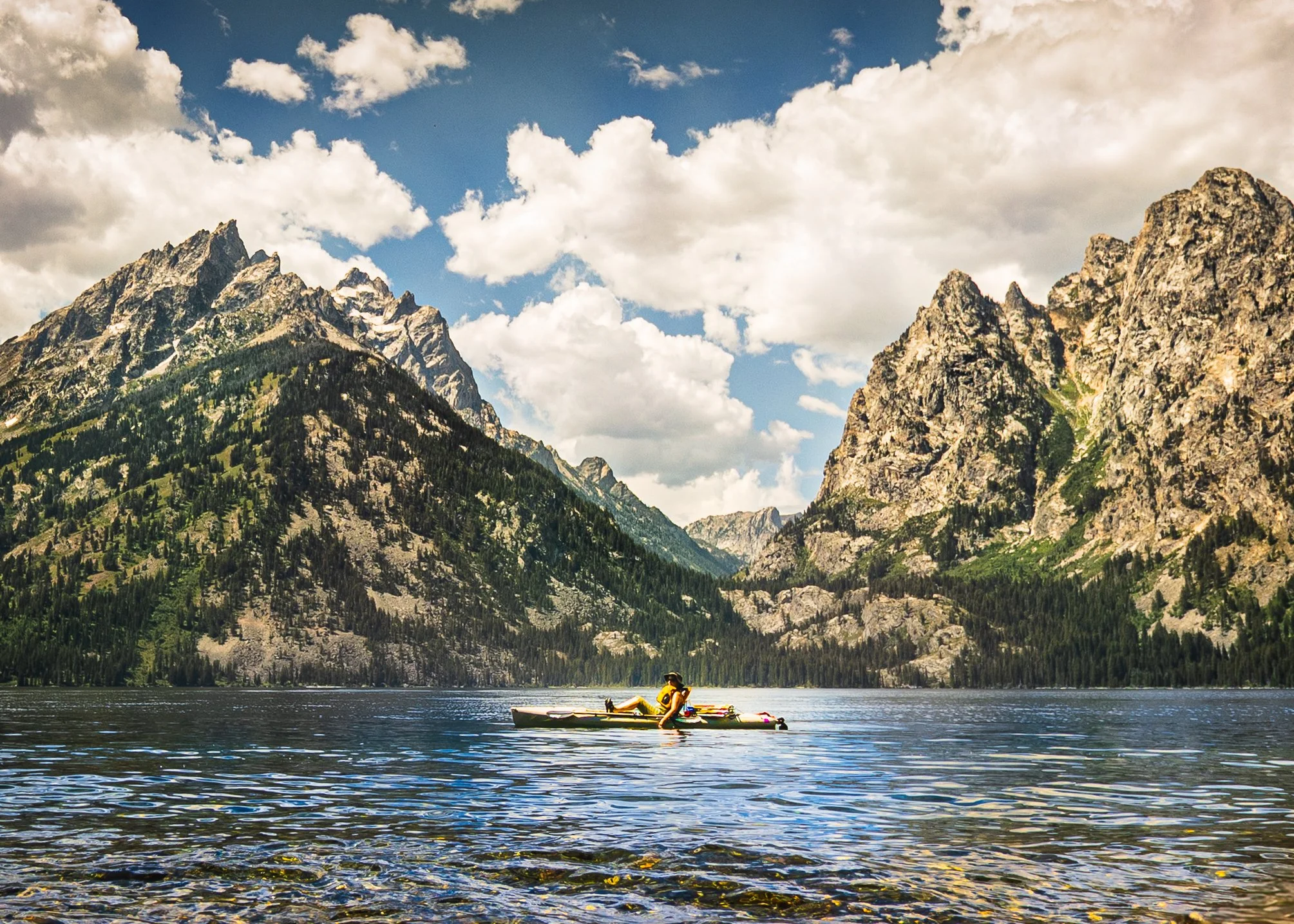 Person kayaking on a mountain lake surrounded by tall, rocky mountains under a partly cloudy sky.
